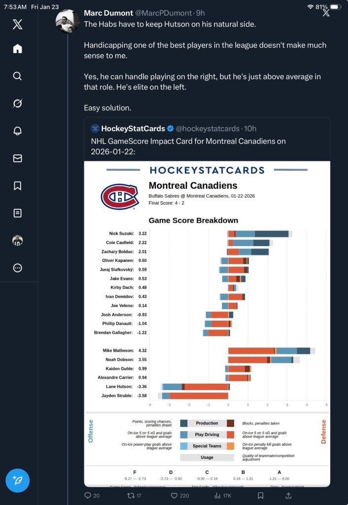 Whatever path the Canadiens take, there is a pressing need to keep Hutson on his strong side. As Marc Dumont said in his post, the Habs can’t continue to “handicap” their best player.