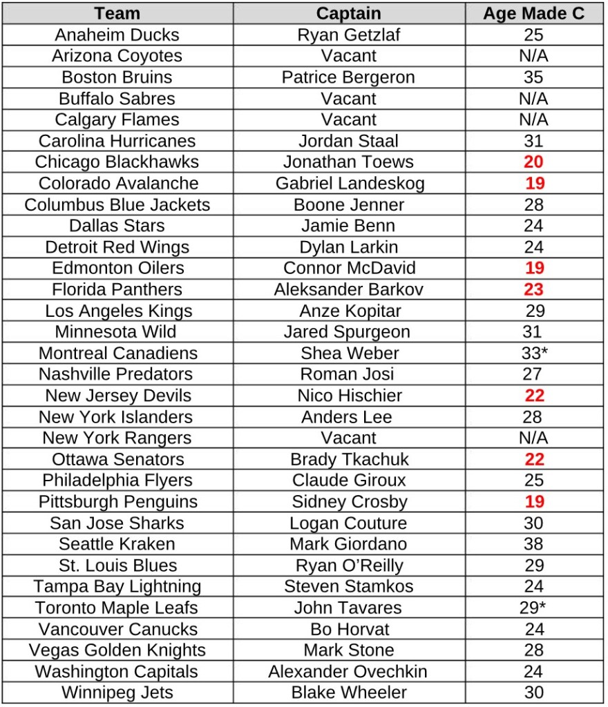 Four teams have captains who were named as 19 or 20-year-olds. This is obviously exceptional, and the group includes Jonathan Toews, Gabriel Landeskog, Connor McDavid and Sidney Crosby.