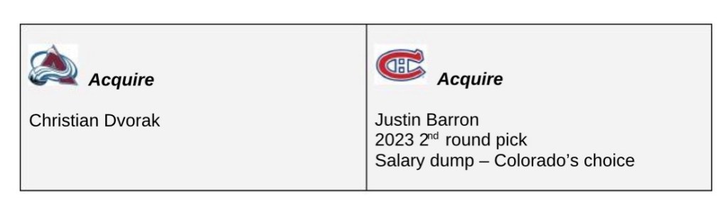In the short term, adding Dvorak brings NHL experience to the centre group. In the long term, Newhook moves into the 2C hole and Dvorak plays 3C. The cap structure works for Colorado beyond this year, but the Habs would need to take a contract back to make it work for this season.