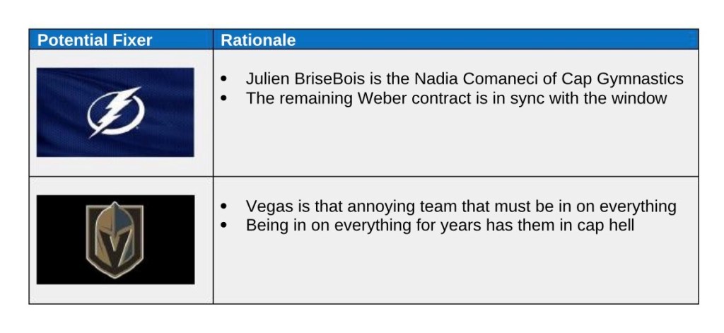 The first category of potential fixers is the group of teams that will need help to hit the cap floor. The Arizona Coyotes are the perfect example of a team who will struggle to reach the cap floor for the next few seasons, and during another rebuild will appreciate the minimal dollars attached to the contract. The Habs were reported to be in discussions with Arizona before they acquired the Bryan Little contract from Winnipeg.