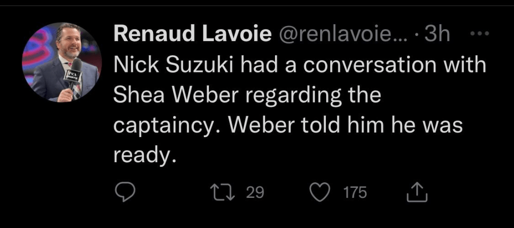 I’m referring to Brendan Gallagher and Joel Edmundson. They were the veteran alternatives to wear the C, at least until Suzuki is ready. I love that HuGo didn’t go with the two-step approach.
