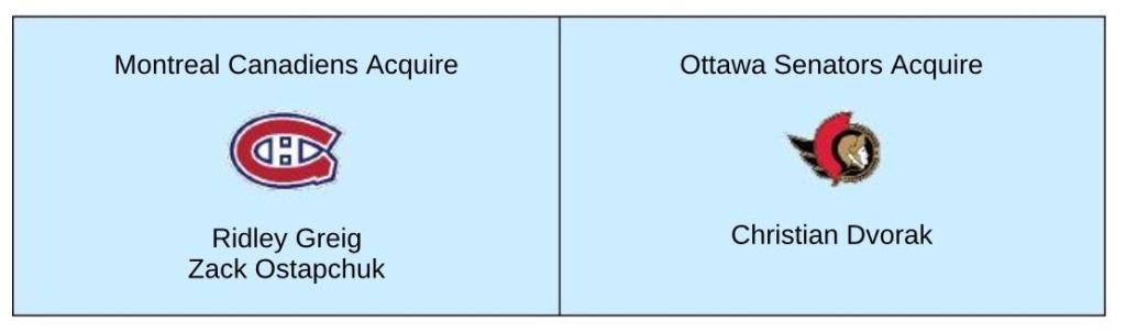 This might be the most bizarre deal in this group, but according to the insiders the Sens still think they’re in it and, in addition to looking for a veteran defender, they would like to add a veteran centre. Dvorak is that veteran who is also under contract. In return, the Habs get a couple of young players that can grow into their line-up.