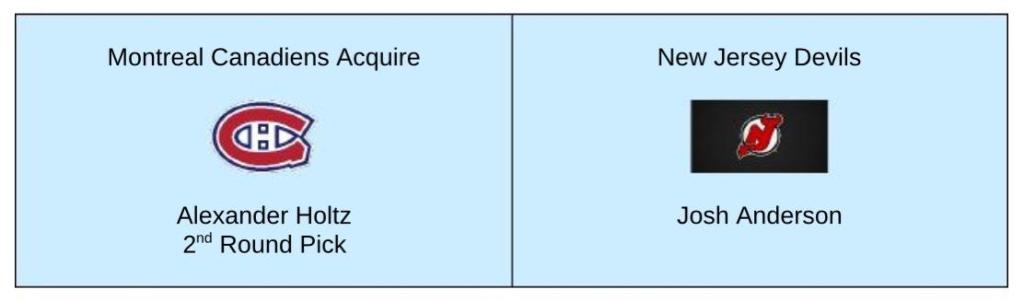 This deal is counting on New Jersey missing out on Timo Meier and being committed to adding someone to their forward group. After watching them against the Habs this week, it was easy to see a fit for Anderson. The Habs would love to get one of Jersey’s right-handed defenders in return, but Holtz is a more realistic ask. Honestly, I’m not sure that return is enough to force Hughes’ hand. Maybe if that 2nd becomes a 1st it’s too good to refuse, but then it’s probably also too good to be true.