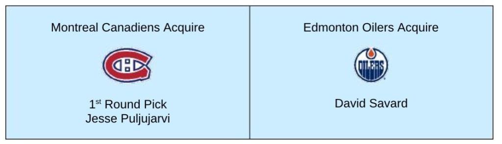 At the beginning of the season I predicted that Joel Edmundson would be traded at the deadline for a first round pick. His back has other ideas, apparently. This proposal makes David Savard available in his place.