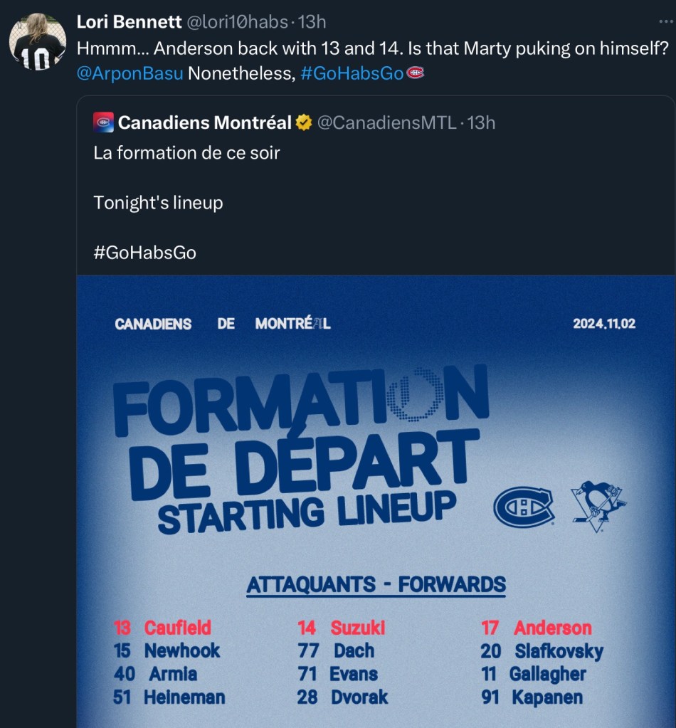 When line combinations were announced for the game against the Pens, fans were left wondering if the coach was picking up his team’s habits. Talk about puking on yourself. At some point, we will have seen Anderson line up for the last time with Suzuki and Caufield. Most of us were hoping we had already seen it.