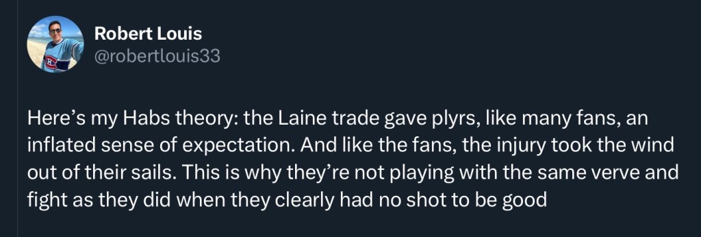 I agree with Rob. The trade to acquire Laine at the end of the off-season, combined with the return of Kirby Dach, was enough to have all of us – fans, media, players, coaches, and management – believing the Canadiens could be “in the mix”. Losing Laine was a serious kick in the swagger.