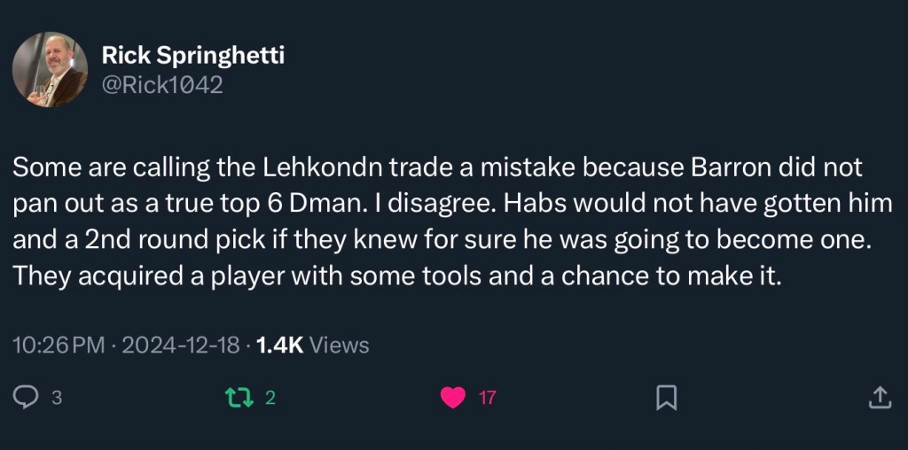 I know some of you loved Artturi Lehkonen. So did I. But he had never reached his potential in Montreal, he was a pending free agent, and the Habs were entering a rebuild. Trading him was the correct call. They targeted a clear team need who was a first round pick and got a second round pick in addition. That’s the risk you take in rebuild trades. This is not a hard concept.
