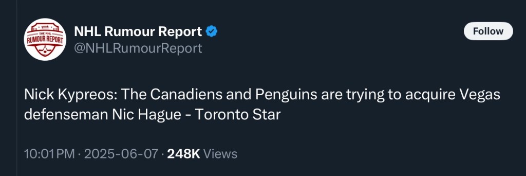 Matheson might be wasted on the third pair supporting Reinbacher or Mailloux, but do you know who wouldn’t be? Nic Hague. And if those kids struggle he could play right side and support Xhekaj or Strubel, I suppose.