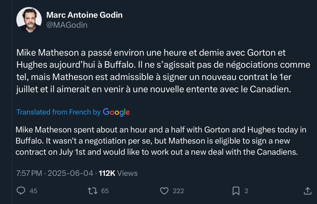 Where does that leave Matheson? He’s not great on the right side, and the price he will command does not match with third pair duty, even if he is the veteran carrying a rookie.