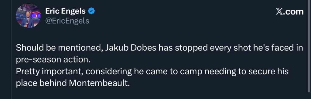Kahkonen has been given a long look, but it’s hard to consider anyone but Dobes backing up Montembeault. The real question is whether he has earned more games this season.
