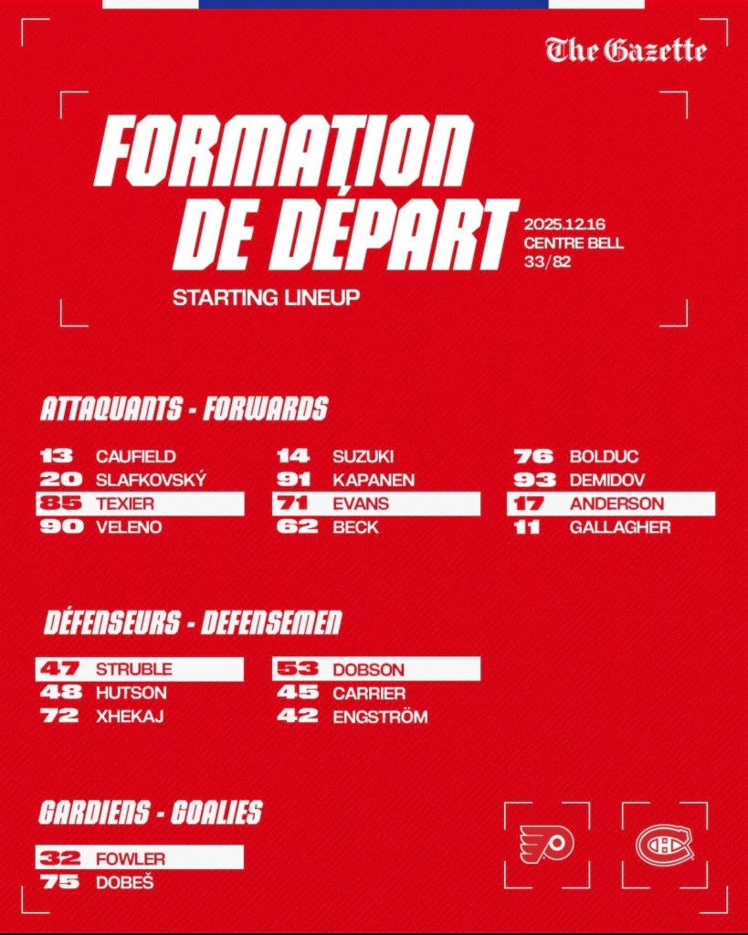 The plan for the net is a giant TBD. Kudos to Sam Montembeault for agreeing to the conditioning stint in Laval. I’m hoping he takes a good chunk of the two weeks allowed and then joins the team for the Florida trip after Christmas.