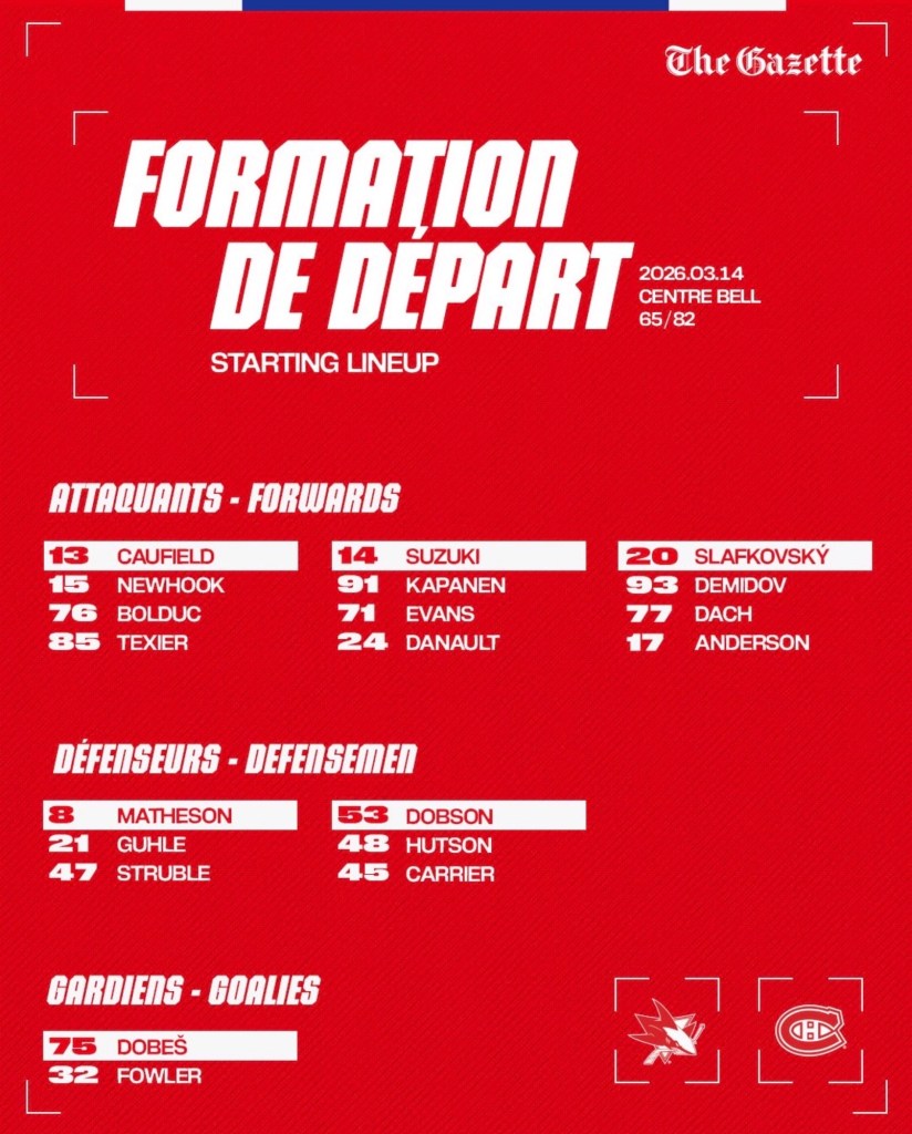 The Montreal Canadiens were back home on Saturday night with the San Jose Sharks visiting. Earlier this month the two teams faced off in California in a goaltender’s nightmare where Jakub Dobes and the Habs lost 7-5. In this one, the coach went back to Dobes and the result was a 4-2 loss.
