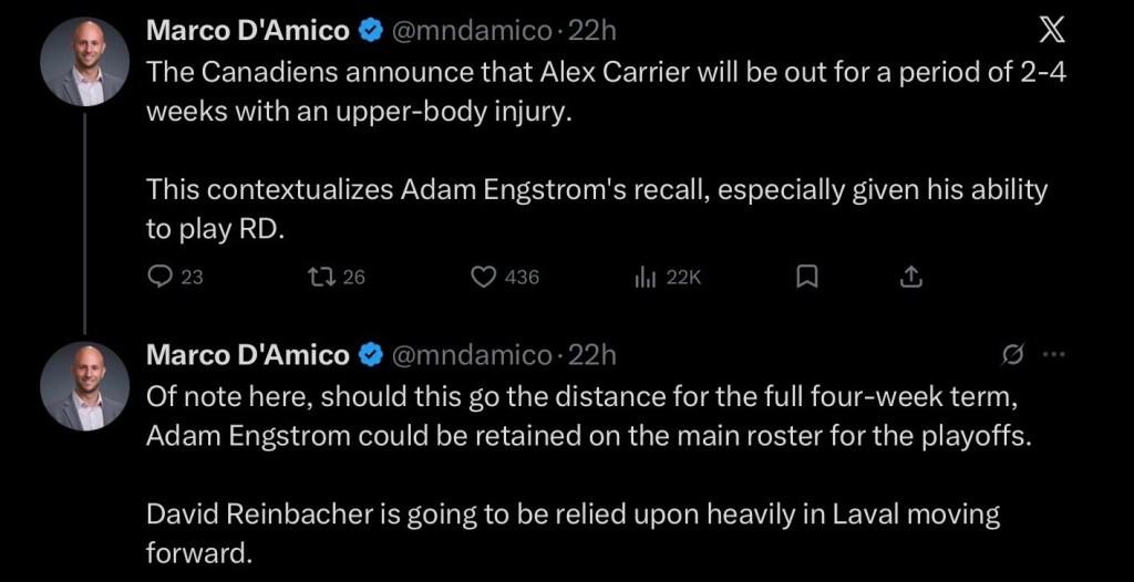 After calling up Adam Engstrom from Laval after Sunday’s game, the Canadiens announced on Tuesday morning that Alex Carrier would be out two to four weeks with an upper body injury. That leaves Noah Dobson as the only right shot D in the line-up.