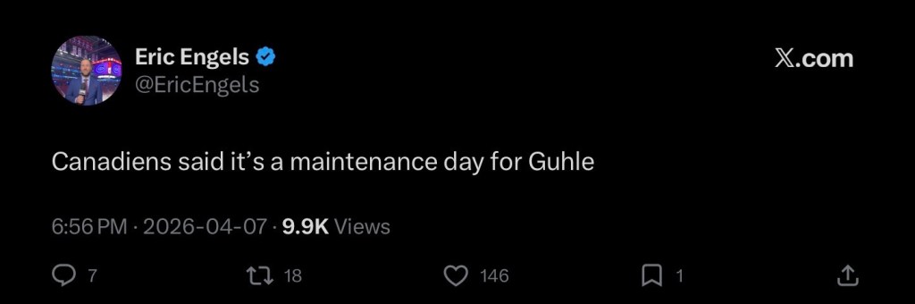 It feels like “maintenance day” is code for something else… like “he’s tweaked something but we can’t tell you Guhle is injured again” or “he’s not been very good for a couple and we thought a look from the press box would help, but that doesn’t fit the Guhle narrative” or “he’s barely back from his last injury so we don’t want to push our luck with playoffs looming”.