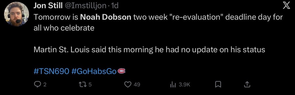 The Canadiens went into this series hoping the defense would hold up until Dobson was healthy. So far, they’re holding up. I suspect the top line is feeling his absence more than most.
